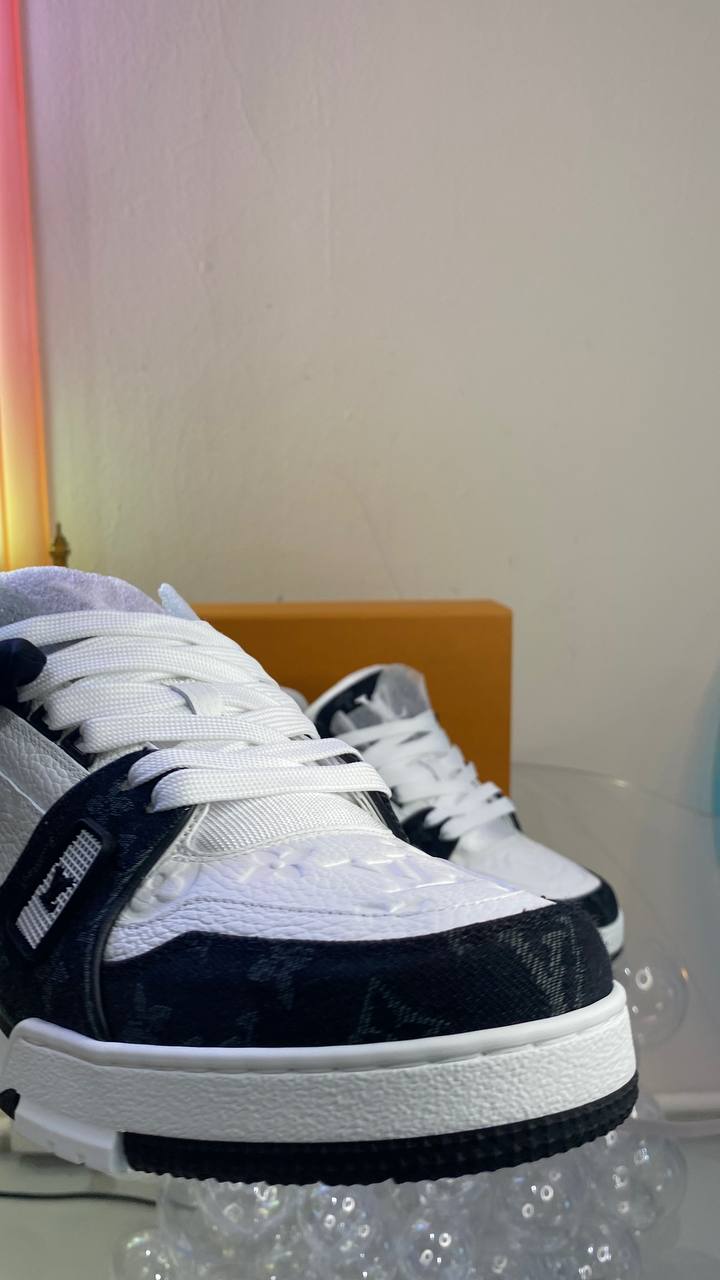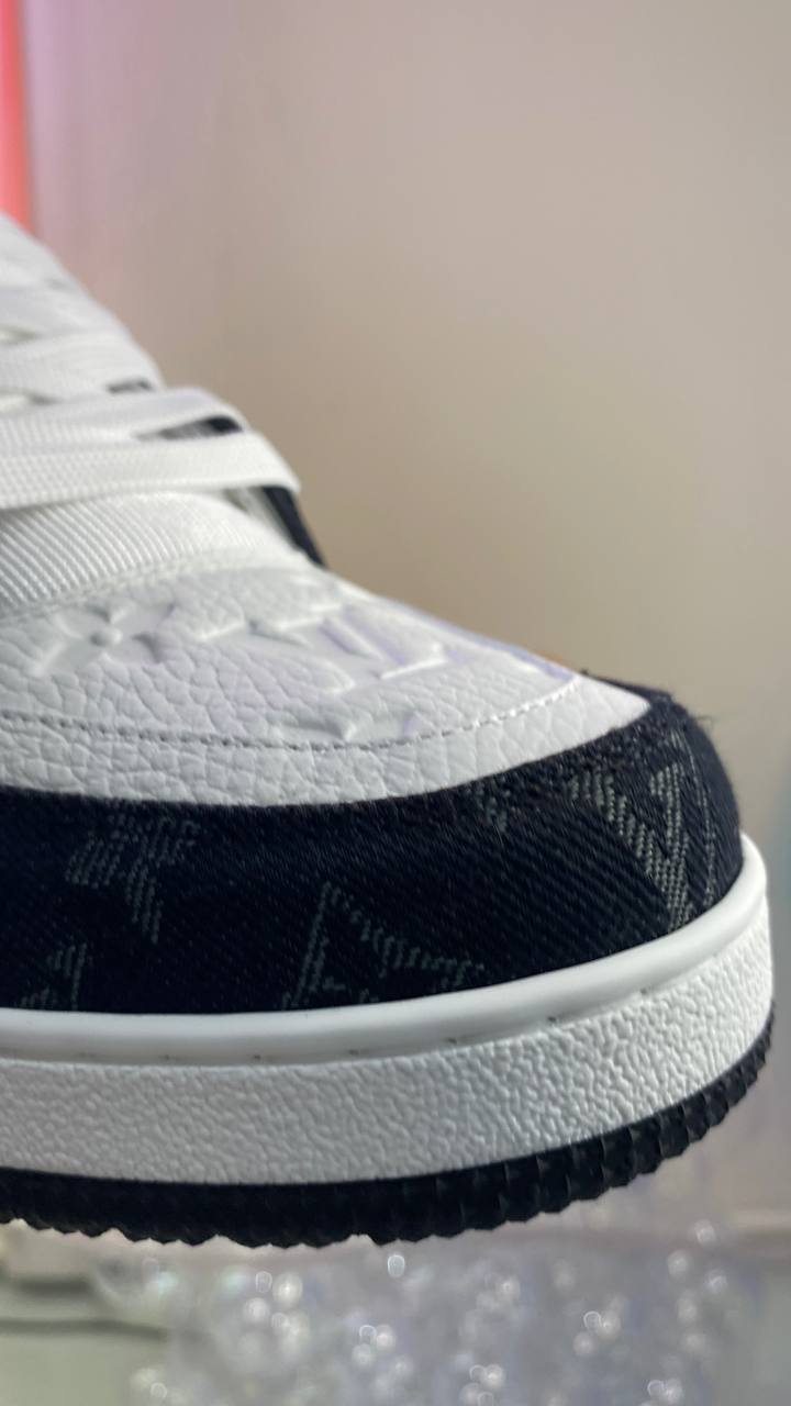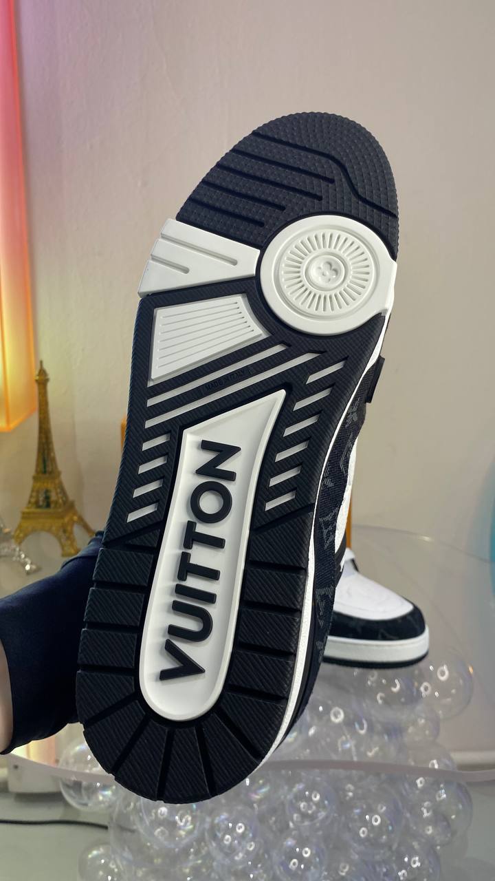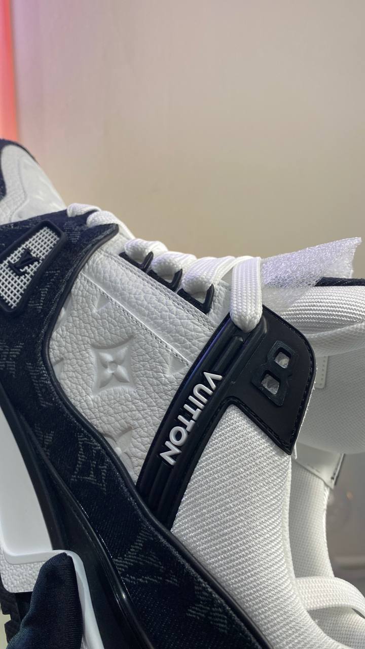 The iconic LV Trainer sneaker is revisited this season in a combination of Monogram denim and Monogram-embossed grained calf leather. The contrasting colors and materials highlight the elaborate construction of this model, which was inspired by vintage basketball sneakers.