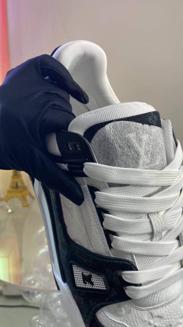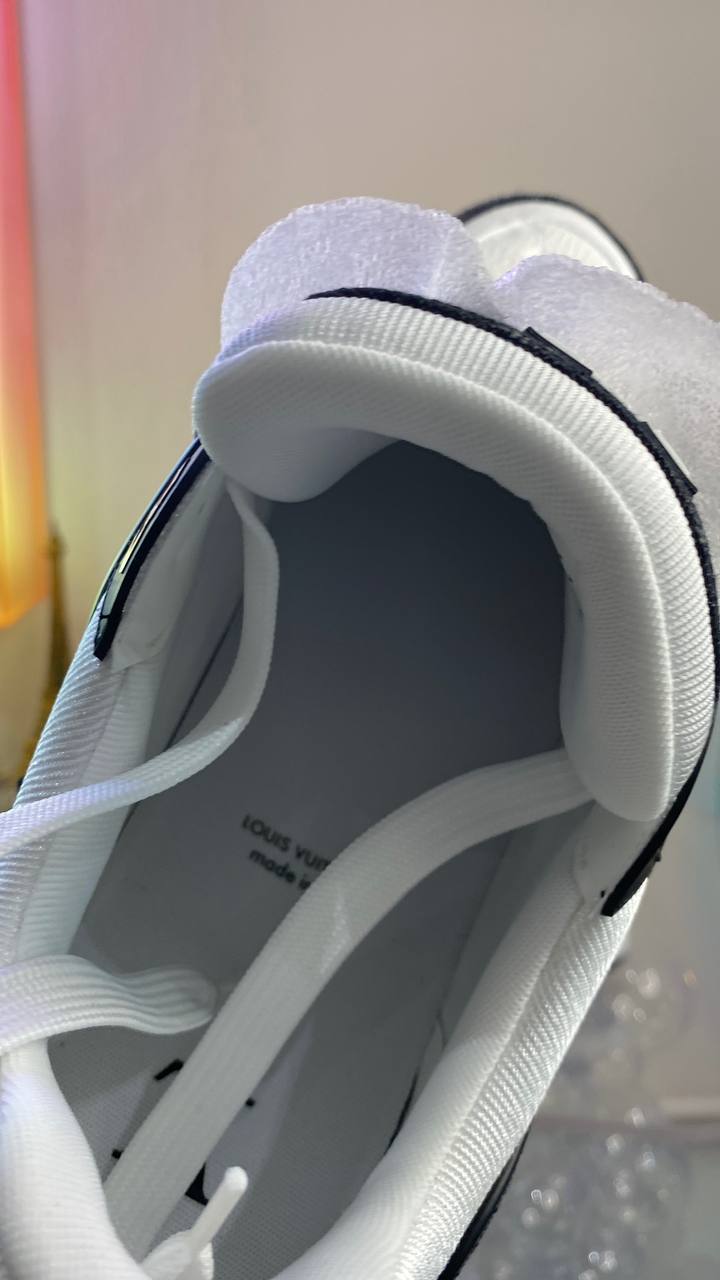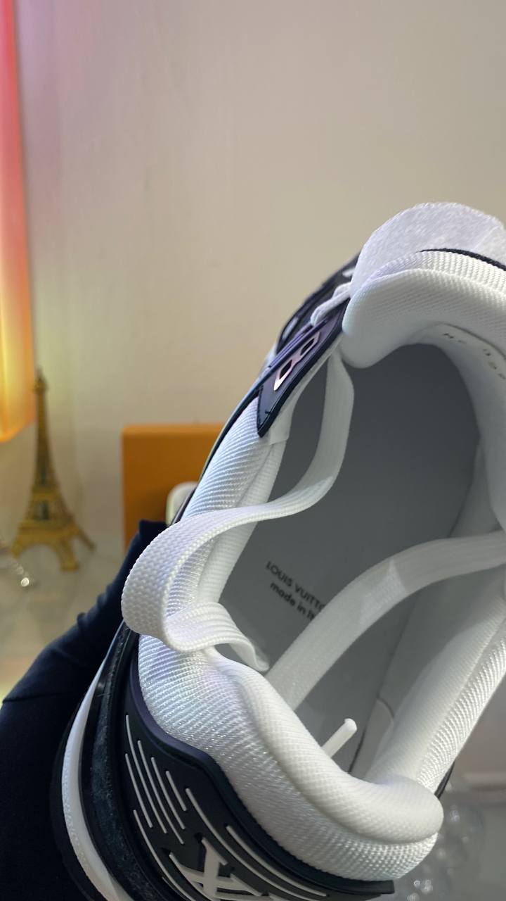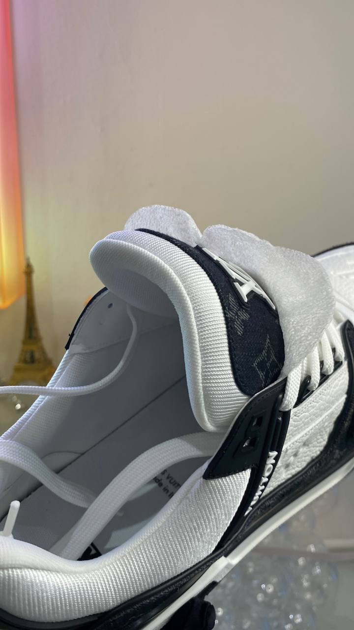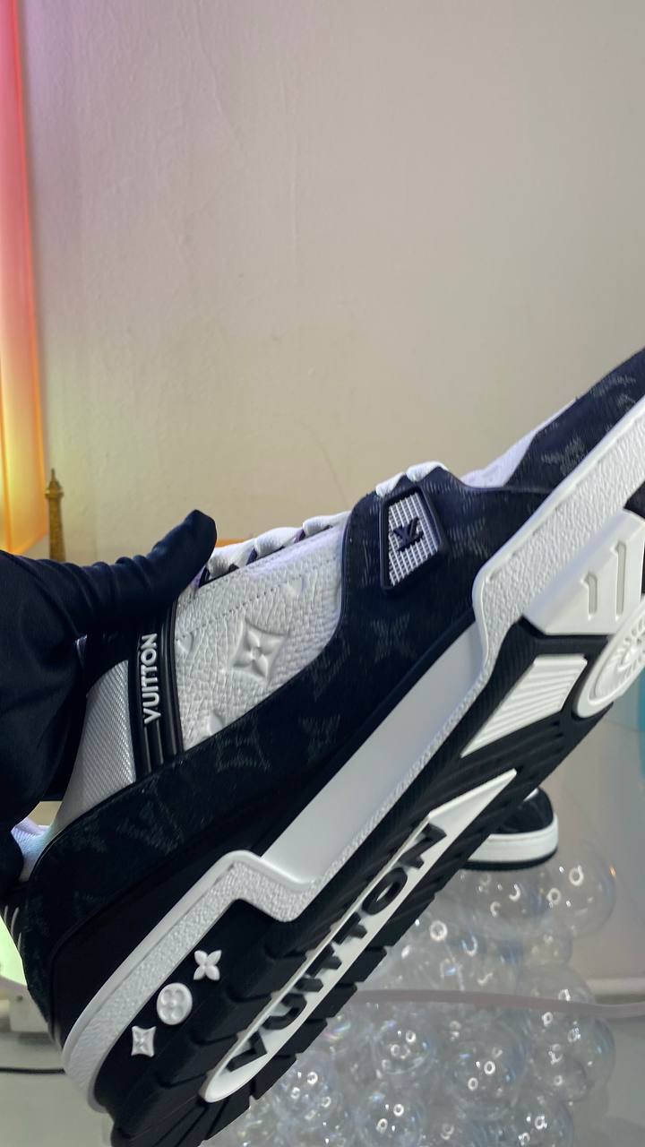 The iconic LV Trainer sneaker is revisited this season in a combination of Monogram denim and Monogram-embossed grained calf leather. The contrasting colors and materials highlight the elaborate construction of this model, which was inspired by vintage basketball sneakers.