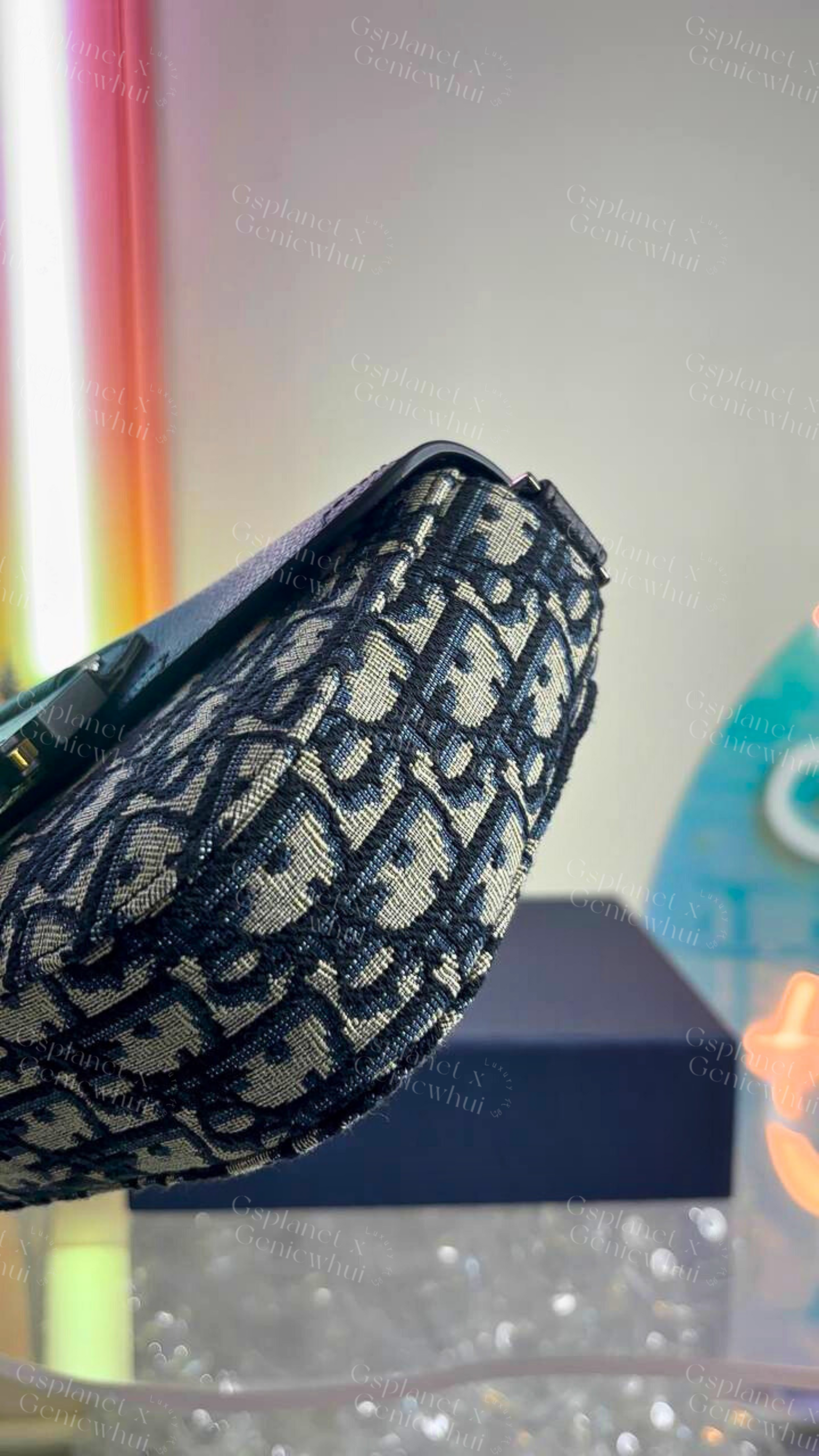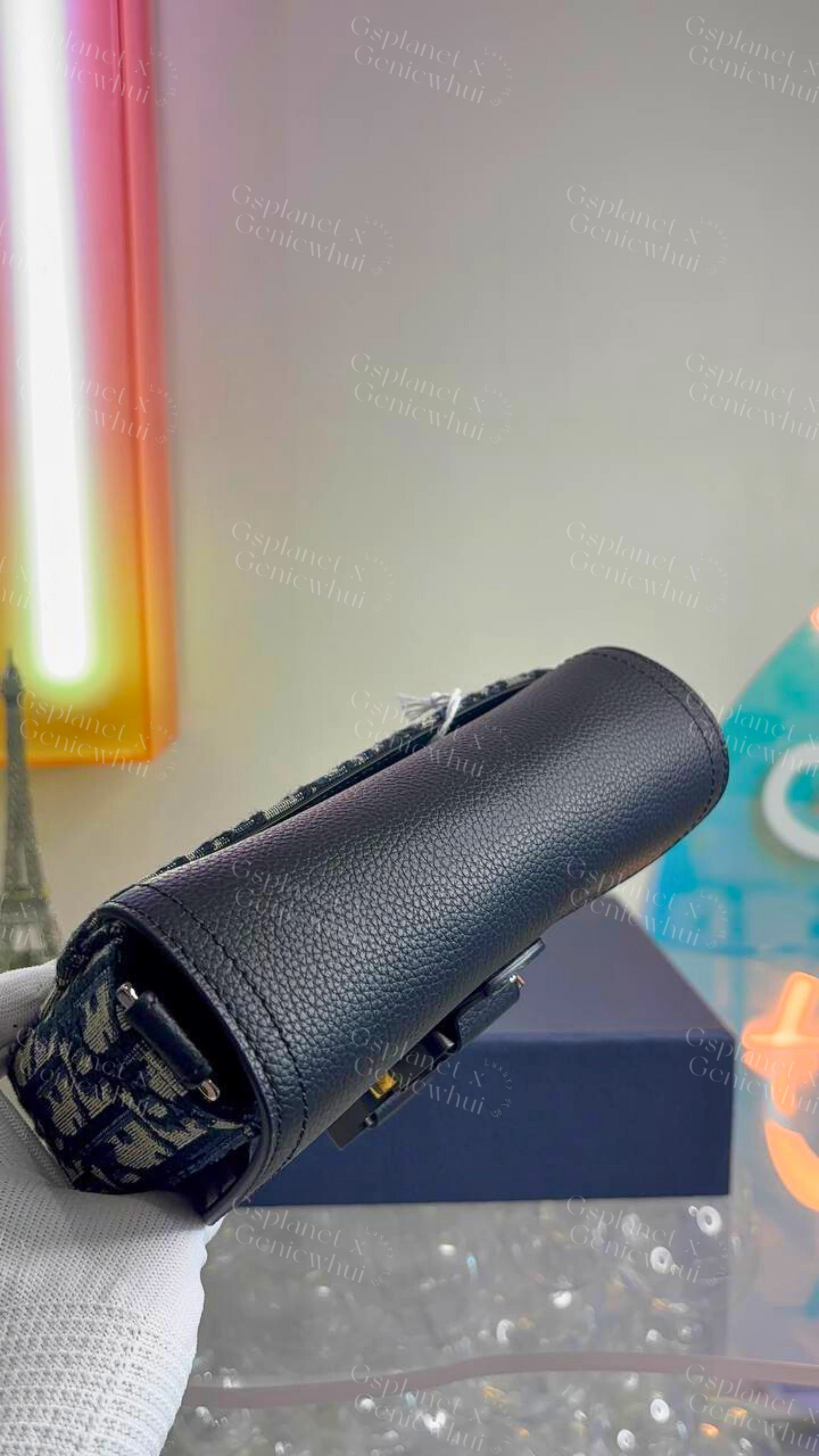 它采用米色和黑色 Dior Oblique 提花面料精制而成,搭配黑色粒面小牛皮马鞍翻盖,并配有铝制 Christian Dior 标志性搭扣。